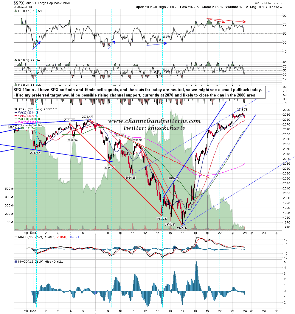 The stats for the last two days have been historically very bullish, but that’s not the case today. If we see some weakness, and we might, then I have a target trendline in the 2070 SPX area at the open today, rising to about 2075 by the early close. SPX 15min chart: