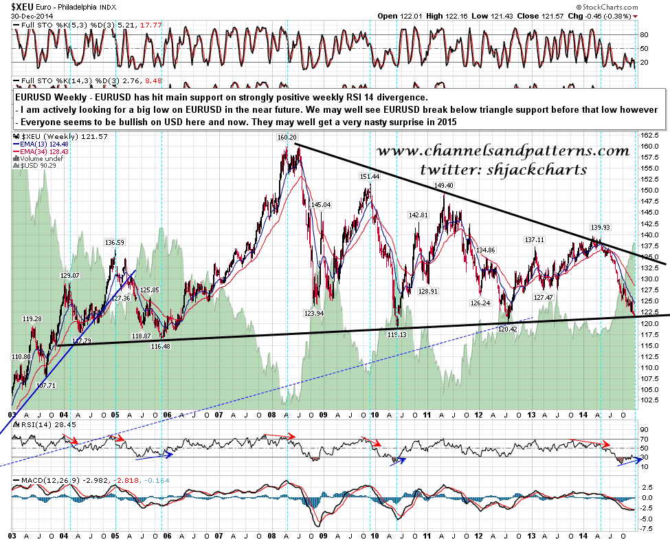 I mention this because there is now a strong consensus that USD will rise a lot next year, and while I expected 2014 to be a good year for USD, I’m thinking that is unlikely to be the case in 2015. Why? Well the weekly EURUSD chart is one that I posted regularly in 2014 forecasting a likely hit of main triangle support from 2004. That has now been hit and the weekly RSI setup here suggests strongly that a major low on EURUSD is getting close. EURUSD might underthrow the triangle a bit here but I am now actively looking for that EURUSD low. When that low is made then EURUSD should be a strong buy and USD, with EURUSD making up 57.6% of the USD index, should then be a strong sell. Again there is an apparently strong fundamental argument that USD should strengthen in 2015 while EURUSD weakens. Again I strongly suspect that we will see the opposite. EURUSD Weekly chart: