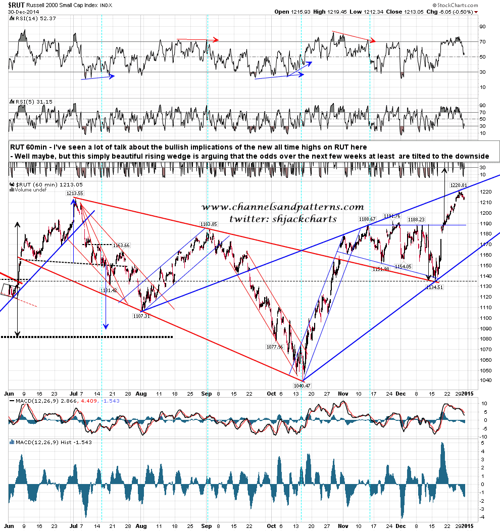 I’ve been reading a lot in recent days about the bullish implications of the new all time highs on RUT. Maybe, but a marginal new high is only bullish if price continues upwards. As the pattern setup on RUT from the October low is a simply beautiful 70% bearish rising wedge, then that may well be a tall order here, at least during the next few weeks. RUT 60min chart: