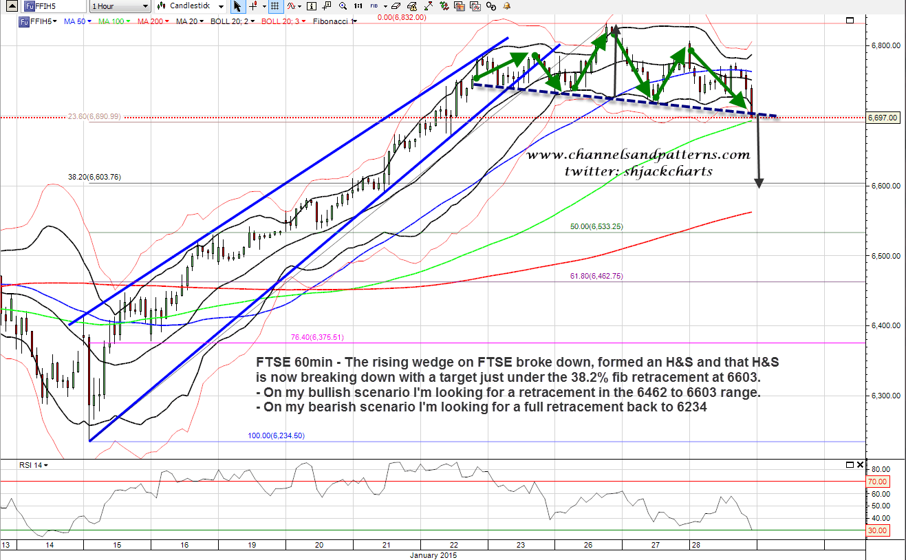 I posted a very nice looking FTSE short setup on twitter yesterday and some of you might consider carving off a slice of this tasty looking morsel. This is the update on the FTSE chart I posted last Friday arguing that FTSE might well be signalling that the bull case wasn’t going to deliver. FTSE 60min chart: