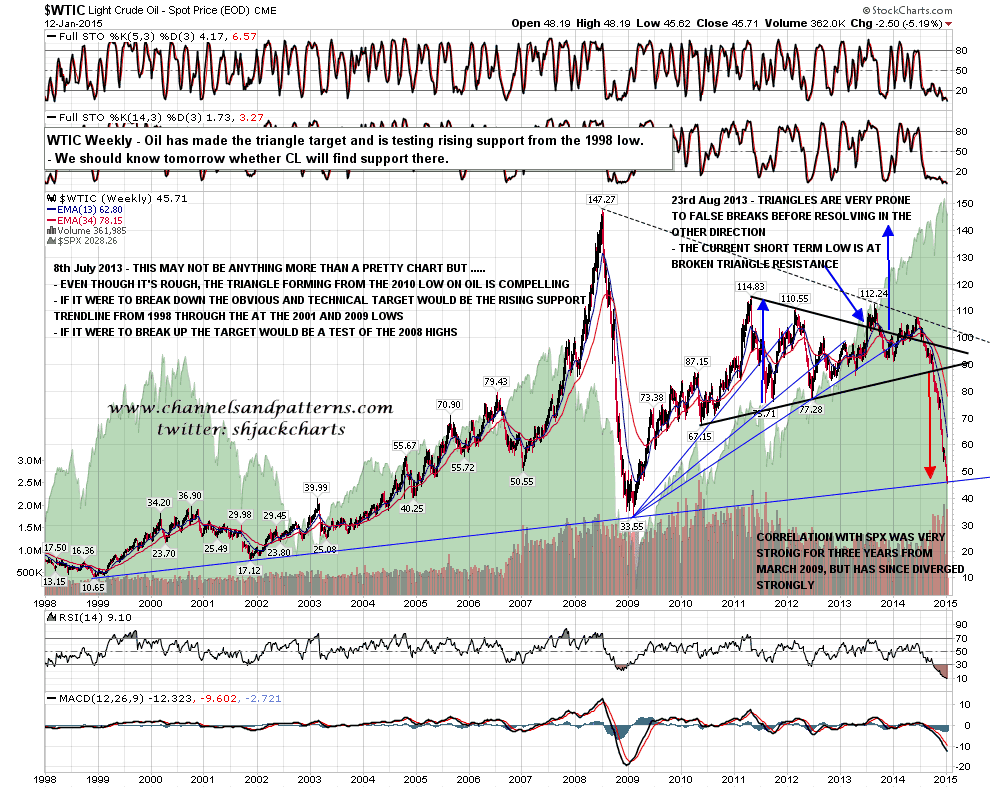 Oil finally hit my main support trendline from the 1998 low yesterday, and broke it with some conviction. We may well see a bounce into the 46s today after yesterdays’s epic 7% decline on CL, but I’d be looking lower after that. WTIC weekly chart: