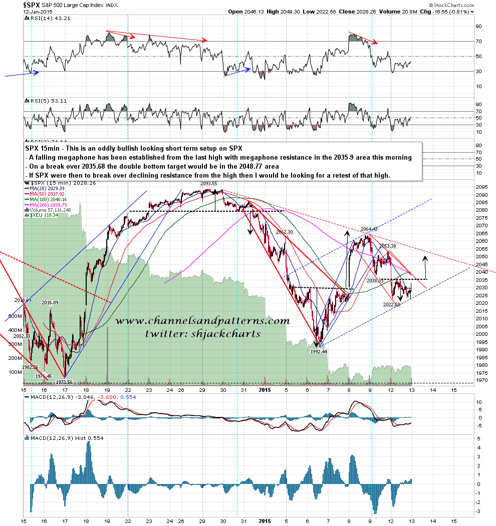 On the 15min chart, by contrast, I’m showing the also not unimpressive short term bull case here. The pattern from the last high is a nice looking falling megaphone, and a short term double bottom has formed that would target the 2049 area on a break over 2036. I have declining resistance from the all time highs now in the 2050-5 area and if that were to break up I’d be looking for a retest of the highs. SPX 15min chart: