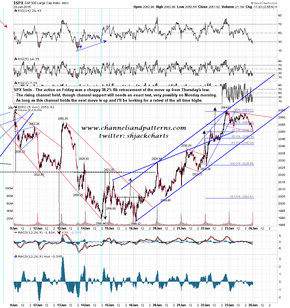 The action on SPX on Friday wasn’t obviously bearish either. The retracement came down and almost hit the rising channel support that I had posted in the morning, and as long as that rising channel from last week’s low holds, this is a bullish setup that may take SPX to a retest of the highs. SPX 5min chart: