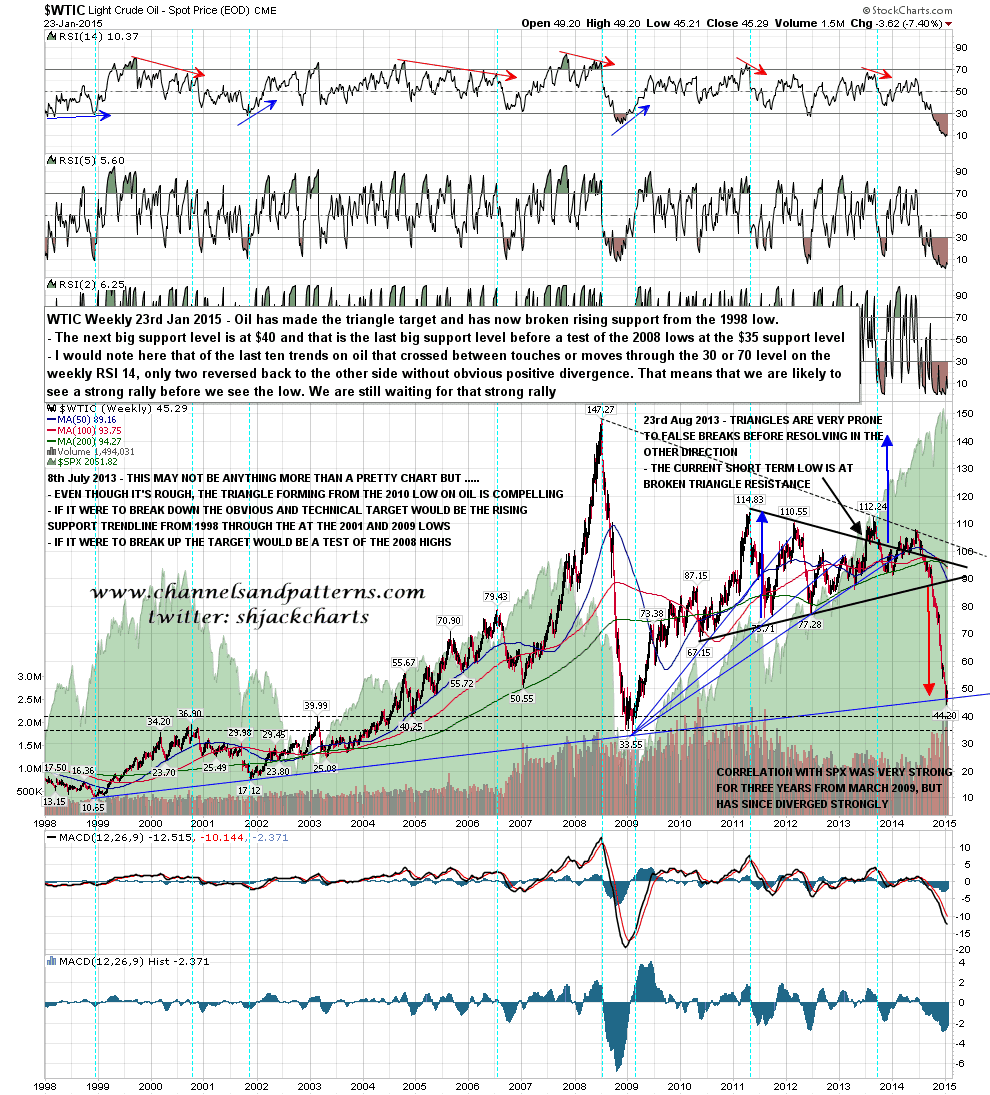 My long term rising support trendline on oil from the 1998 low broke on a weekly basis on Friday. That is bearish and the next big support level is 40. Short term there is a possible double bottom in place that could deliver a significant bounce. Generally we would see a decent bounce before the main low, though not always. WTIC weekly main chart: