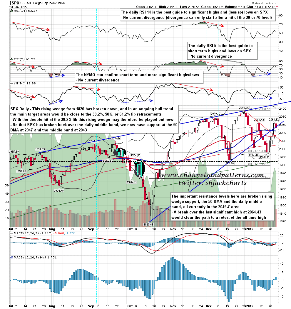 On the daily chart there is now support at the 50 DMA at 2047 and daily middle band support at 2043, and it’s going to be hard to get that excited about the short side until we see a break back below the daily middle band that holds into a daily close significantly below it. SPX daily chart:
