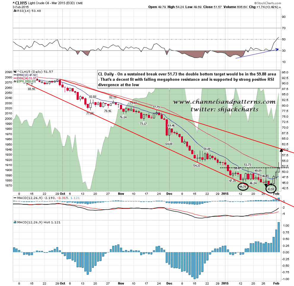 On CL a smaller double bottom has already played out and CL is testing resistance on a larger double bottom that would target 59.88 on a sustained break over 51.73. That would be a decent fit with declining (possibly megaphone) resistance and I think this might well play out. This current move should be the strong rally before the low that I have mentioned a few times and after this move ends I’ll be looking for a retest of the lows to continue to set up a larger bottoming pattern. CL daily chart: