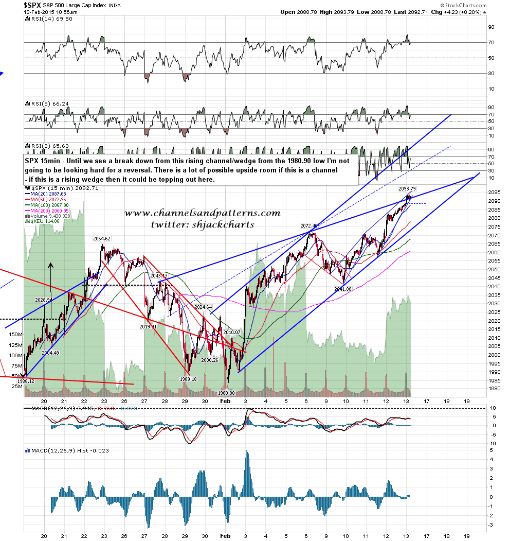 How will we tell if there is strong rejection at the current highs resistance area? The first very bearish sign would be a break below rising wedge or channel resistance, as that break would confirm this as a rising wedge, and open up wedge retracement targets in the 2051 (38.2% fib), 2038 (50% fib), and 2024 (61.8% fib) areas. If bears could then deliver a conviction break back below the daily middle band, now at 2044, then there would be a possible double top setup that would target the 1866 area on a break back below the last low at 1980.90. That would be a decent match with my main rising support trendline from the 2011 low so I’m watching this resistance test with great interest. SPX 15min chart: