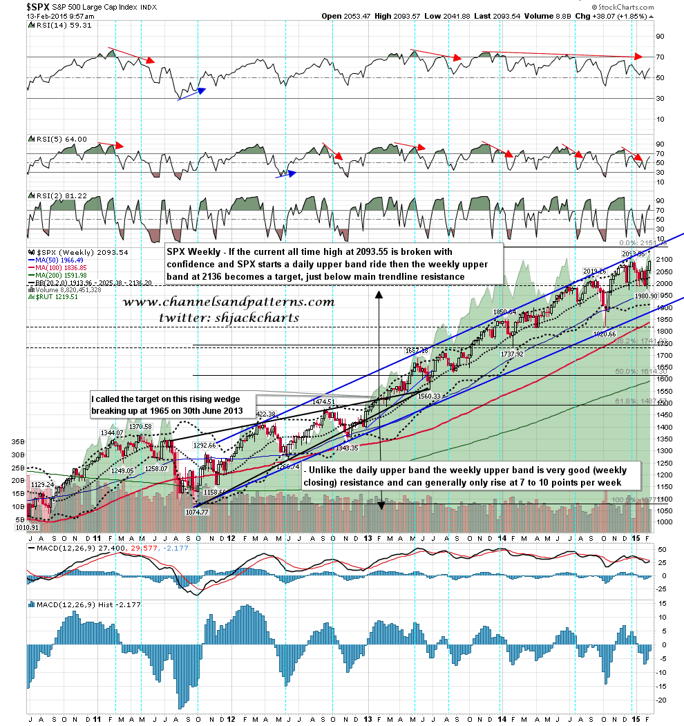 The next big level of resistance is on the weekly chart, at the weekly upper band, now at 2136 and just below main trendline resistance. If hit I would be expecting this area to hold and provide a very nice short entry. SPX weekly chart: