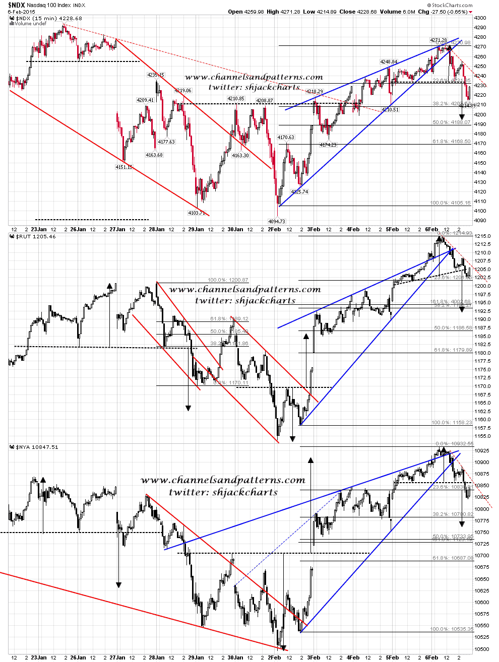 All of these H&S patterns broke down on Friday afternoon and none of them have made target yet. 3x chart screen 15min NDX RUT NYA: