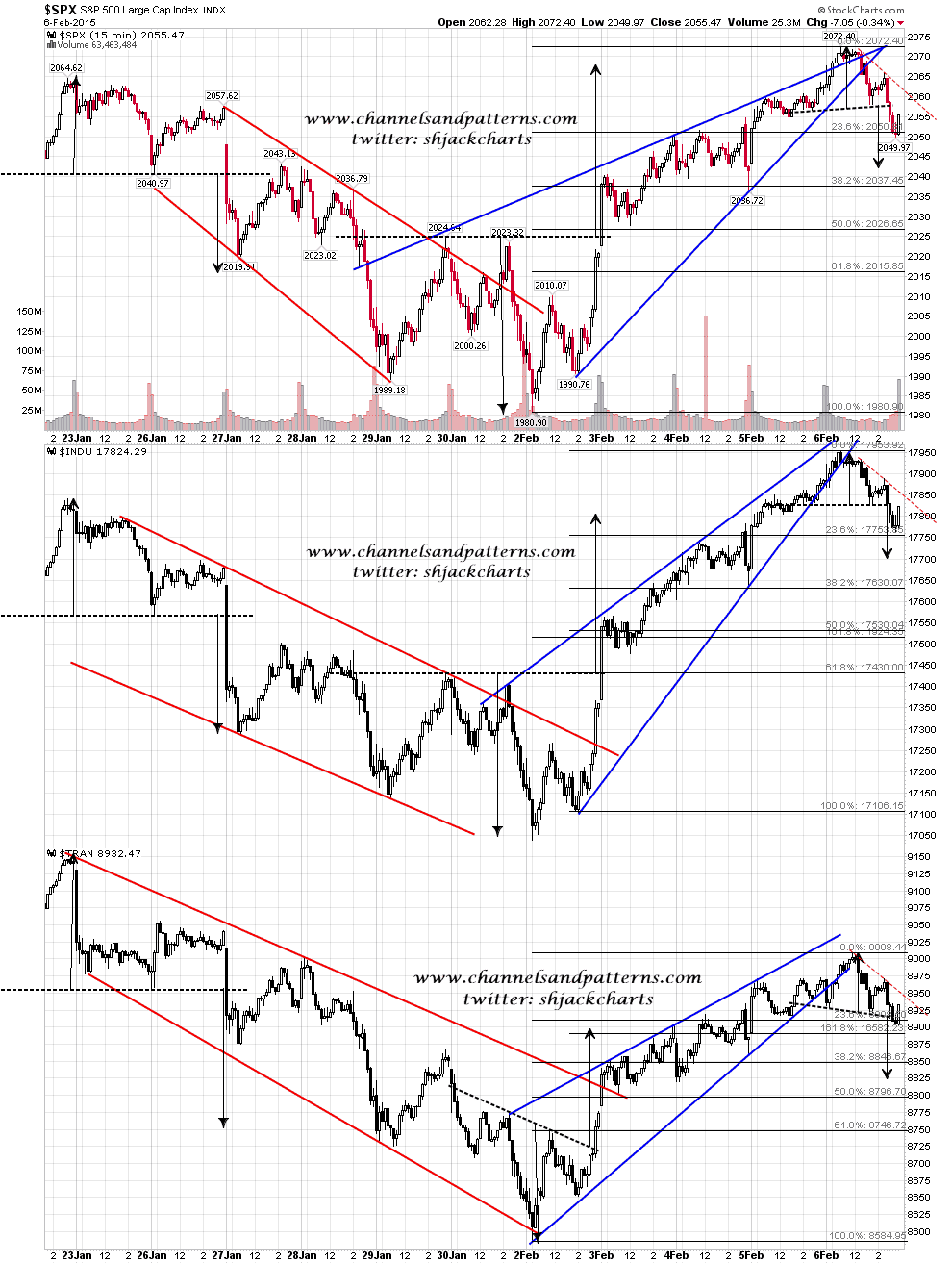 All the rising wedges that I was looking at on Friday morning broke down in the afternoon and all of them formed H&S patterns that were looking lower. The H&S target on SPX is in the 2042 area, but I’m expecting a bit lower to test the daily middle band. 3x chart screen 15min SPX INDU TRAN: