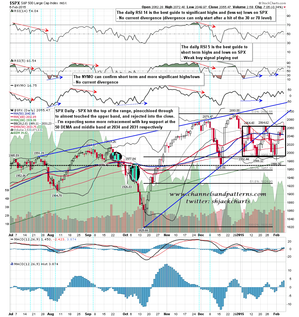 On the daily chart SPX reached the top of the range and pinocchioed it slightly to make the IHS target at 2069. There was then rejection and the close was back well within the range. I would expect some follow through on the downside today and would expect a test of the 50 DEMA and the middle band in the 2031-4 area, most likely today. SPX daily chart: