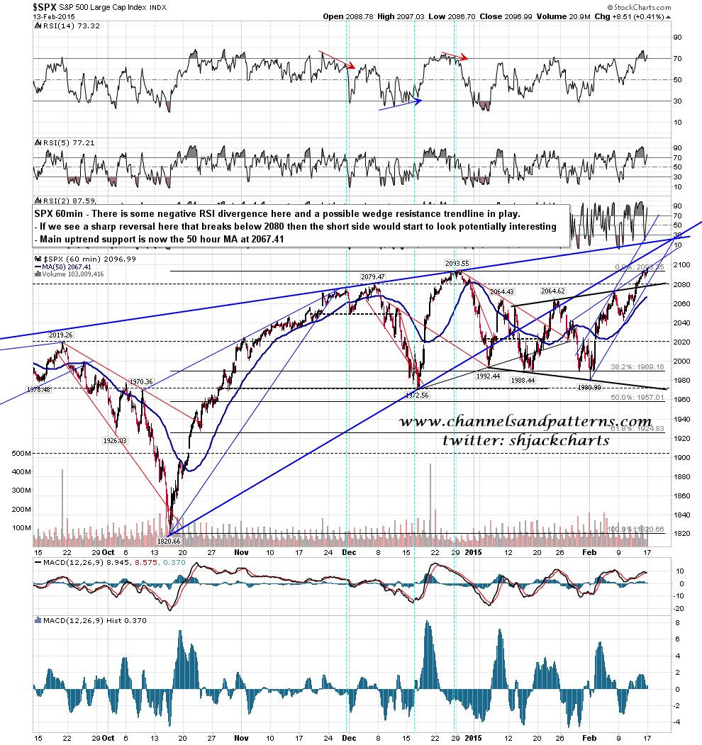 For the moment there is some negative divergence on the 60min RSI and a decent push down here could break that down into a sell signal. I have possible rising wedge support in the 2080 area, and main uptrend support at the 50 hour MA at 2067.40. SPX 60min chart: