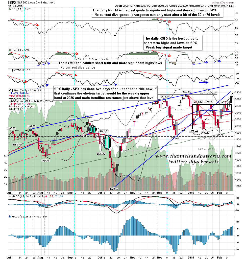 On the daily chart Friday was the second day of a possible 5min upper band ride. This could fail at any time of course, but the bulls have the ball as long as it lasts and if it persists into this week then the obvious targets are in the 2135-50 area. SPX daily chart: