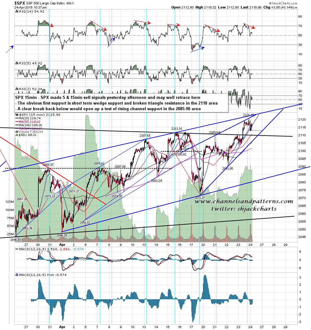 Obviously the triangle broke up yesterday. SPX made a marginal new all time high and so on. I have a possible channel resistance trendline drawn in on the chart below that hasn’t been tested yet and may well hold. I have open 5min and 15min chart sell signals triggered at the highs yesterday and a rising wedge from the 2072 low. If we see weakness today there is obvious support at wedge support and broken triangle resistance in the 2110 area. On a break below there I would have main rising support in the 2080-5 area, but I’d be surprised to see a move there before a hit of rising channel resistance in the 2123-5 area. After that hit I’d be looking for a likely retracement to channel support before the next, and very possibly last, move up. SPX 15min chart: