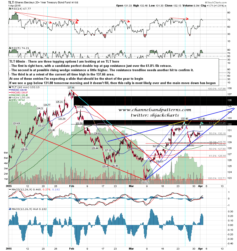 There is a very nice looking reversal setup on TLT here for a reversal back down into what might well be a huge move down. I’m watching for a gap under 131.88 this morning to set the ball rolling. If not then I have two other inflection areas shown on the chart below. TLT is very likely to fail hard at one of these three. TLT 60min chart: