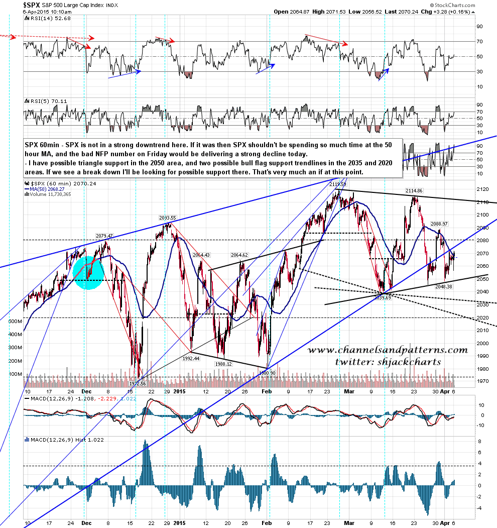 One thing I always say in an uptrend or a downtrend is that as a strong uptrend should hold the 50 hour MA until it is topping out and a strong downtrend should hold it as resistance until it is bottoming out. The 50 hour MA was at 2068 at the test this morning, and SPX has now broken over 10 handles above that. At the very least this is not a strong downtrend. SPX 60min chart: