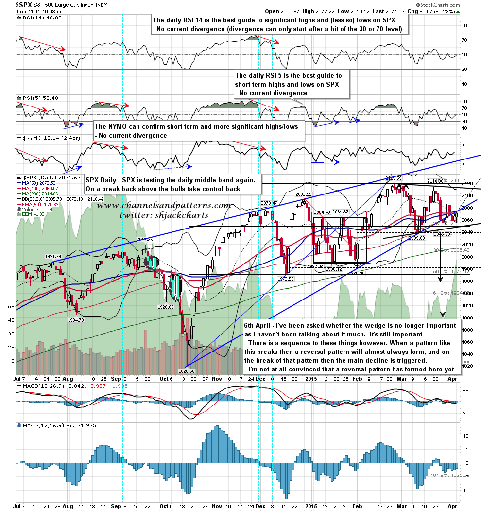 Since I capped the daily chart below the push up from the open has now broken back up over the daily middle band at 2073.l. If that break holds into the close the the bulls are taking back control of the tape here. SPX daily chart: