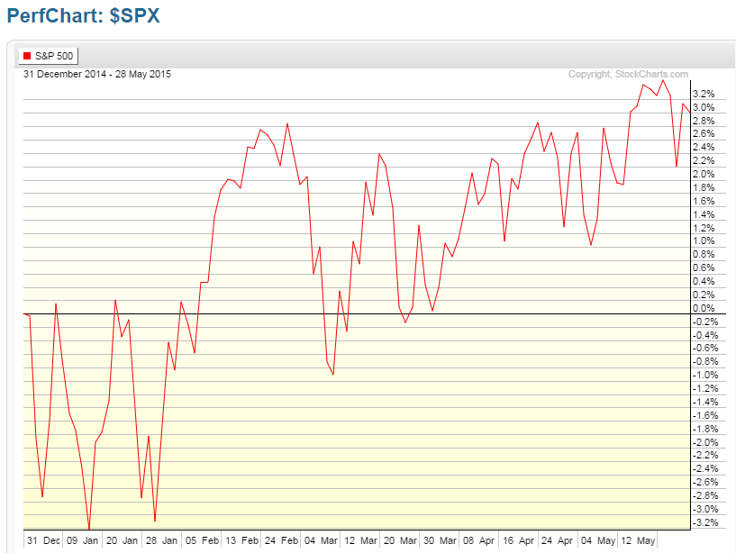 Without the benefit of any further QE from the Fed, buyers will likely be reluctant to commit new money into this market, which is up 204.57% since the closing-low on March 3, 2009, as shown on the percentage-gained graph below. So, while the SPX continues to consolidate, we’ll see the 50 and 200 MAs eventually merge until price, finally, breaks up or down. Once a bearish moving average Death Cross forms, we should see a significant drop in price. Until then, expect more of the same…and, my 2015 outlook for equities may very well come into fruition…at the moment, the SPX is up 3.01% year-to-date, as shown on the last percentage-gained graph…I had forecast an overall price increase of 4% for this year (it reached 3.49% on May 21st…the target high to be surpassed and held if bulls are to remain in control).