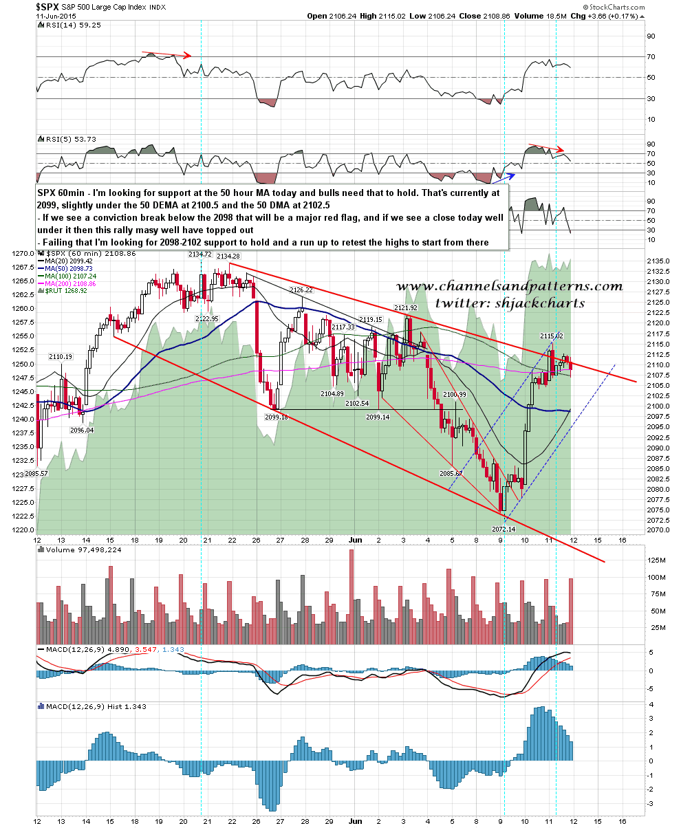 Yesterday went much as expected, with a first test of the daily middle band that failed. Overnight ES has retraced to test support, which on ES is in the 2098 (50 hour MA) to 2102.5 (50 DMA) range. If this area holds today then I would expect another attempt at the daily middle band with a break up, before a retest of the all time highs. If we instead see a hard break of support today then the picture gets a lot darker, and we might well break back down hard. SPX 60min chart: