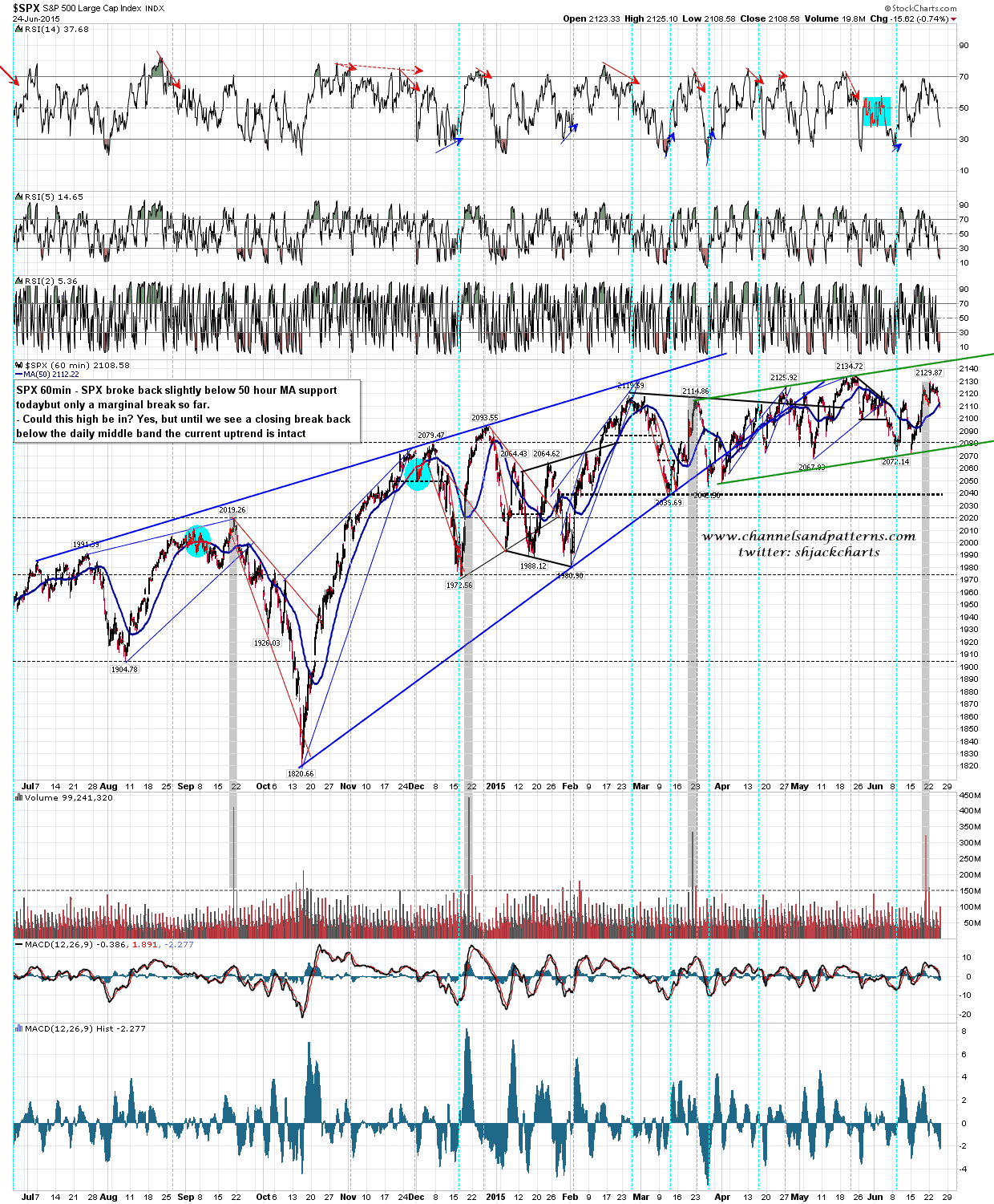 I’m leaning bullish today unless bears can break below daily middle band support. If we see an intraday break under 2103 then the odds will shift towards the 2015 high being made and on a close below the middle band I’d be looking for a probable retest of 2072 area support.