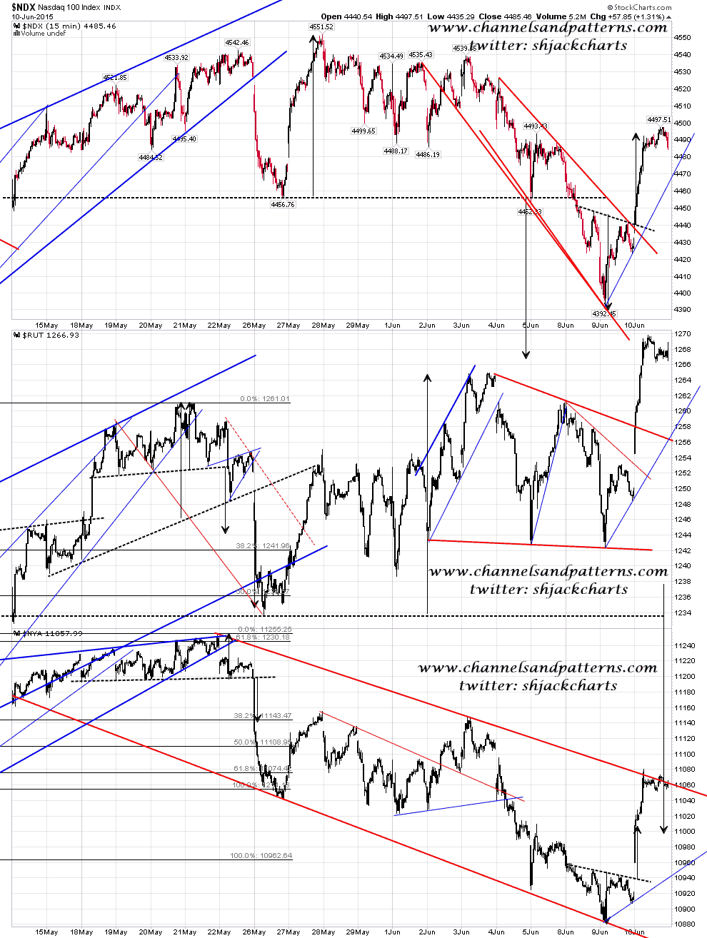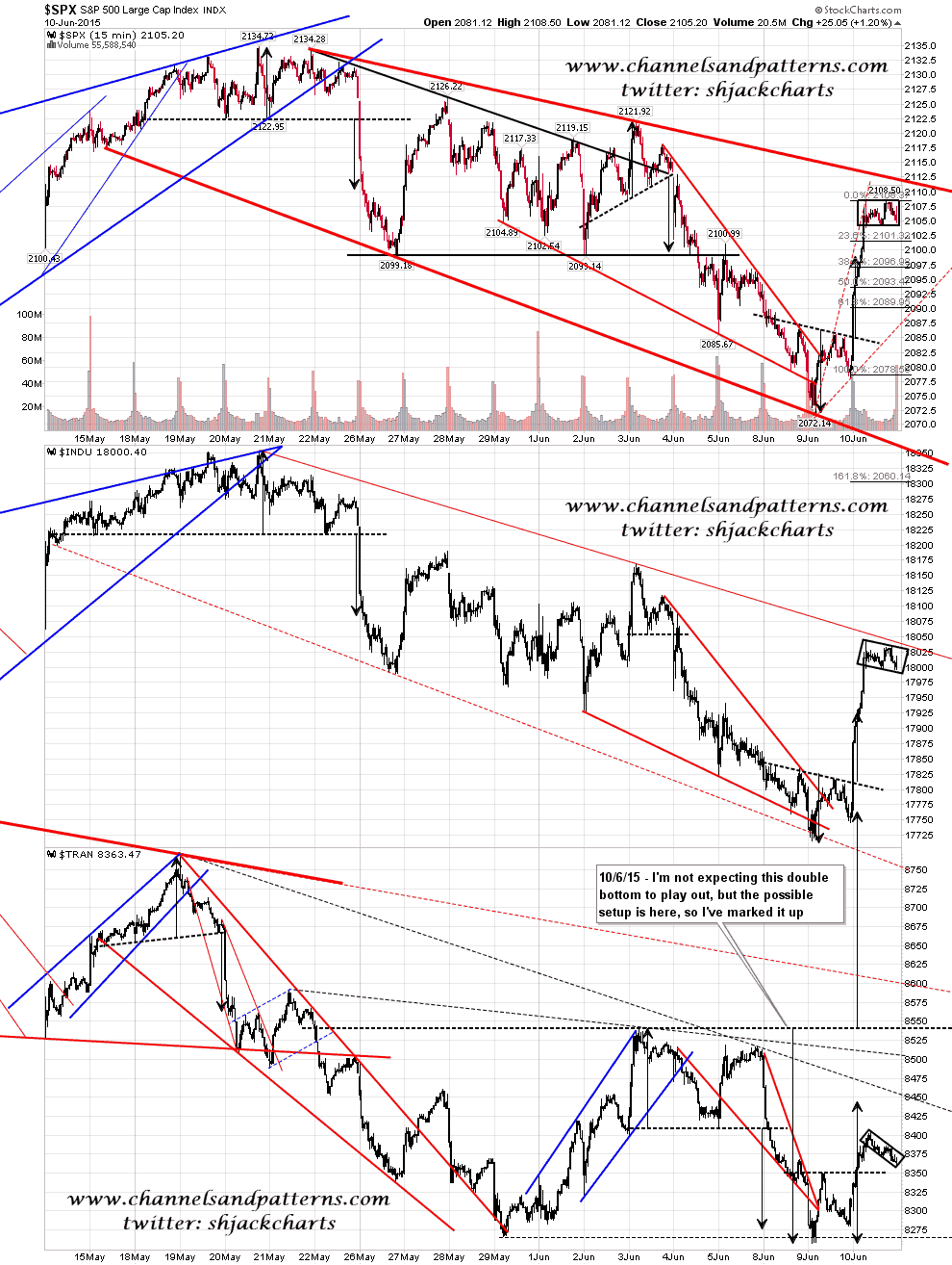 All the reversal patterns that I posted yesterday morning had made their targets by the close yesterday, as had the fixed 15min buy signal that I mentioned. The SPX chart below illustrates why the 2111/2 area is important here at it is (70% bullish) falling megaphone resistance. Scan 3x 15min SPX INDU TRAN charts: