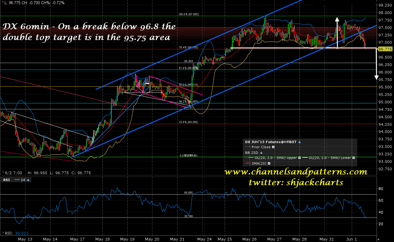 DX has broken rising channel support and formed a small double top. On a sustained break below 96.8 the double top target will be in the 95.75 area. This move would most likely be supportive of both oil and gold. DX 60min chart: