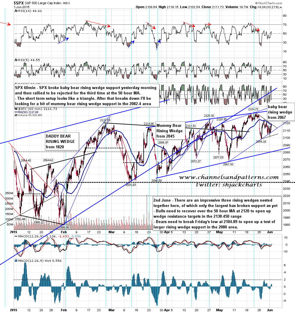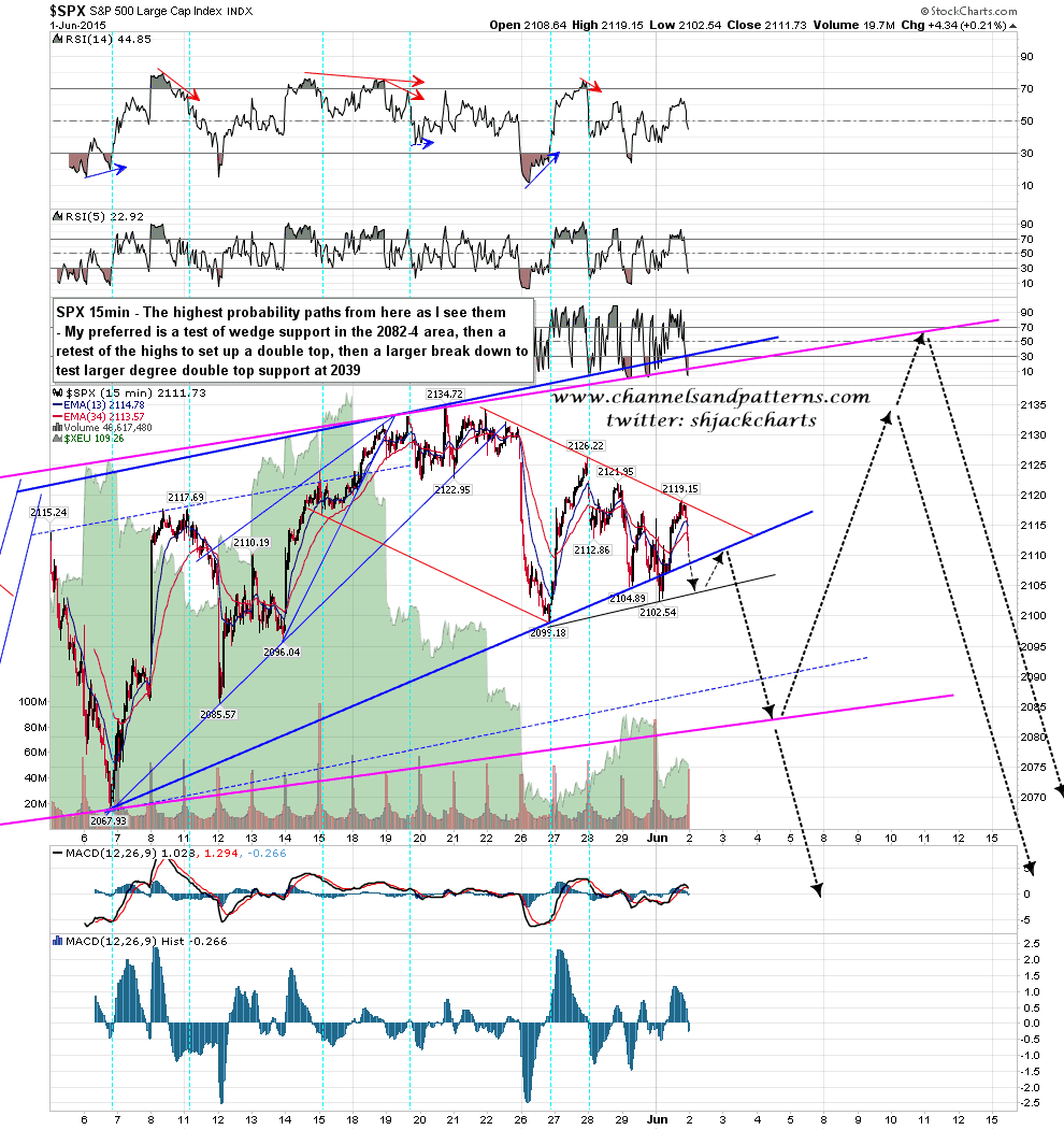 The short term pattern is either yet another triangle, or a falling channel from 2134.Unless we see a break back up over declining resistance from 2134, the effect should be much the same. I’ve marked up the higher probability paths from here in my view. SPX 15min chart: