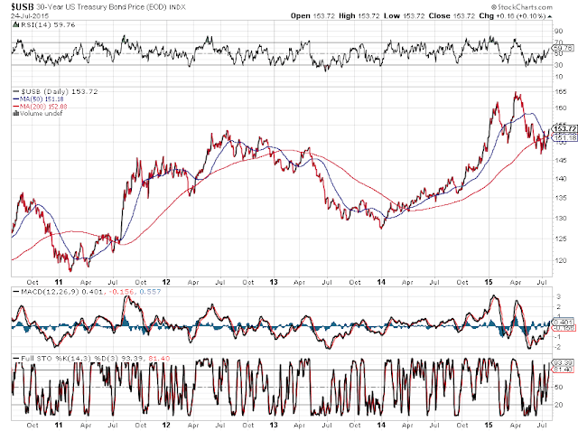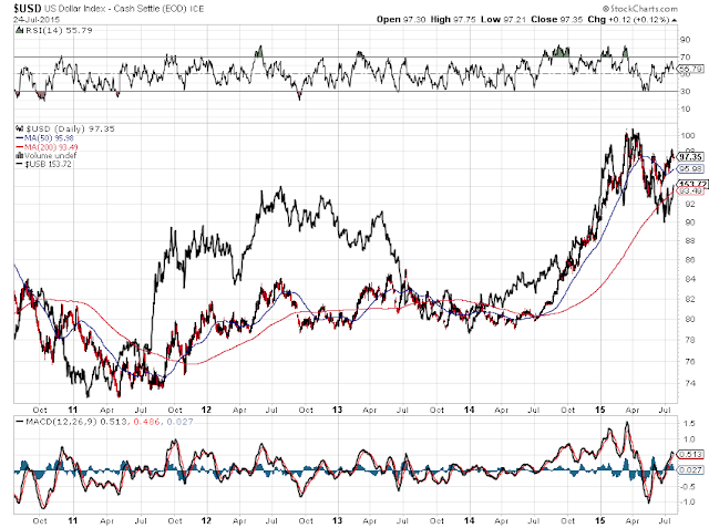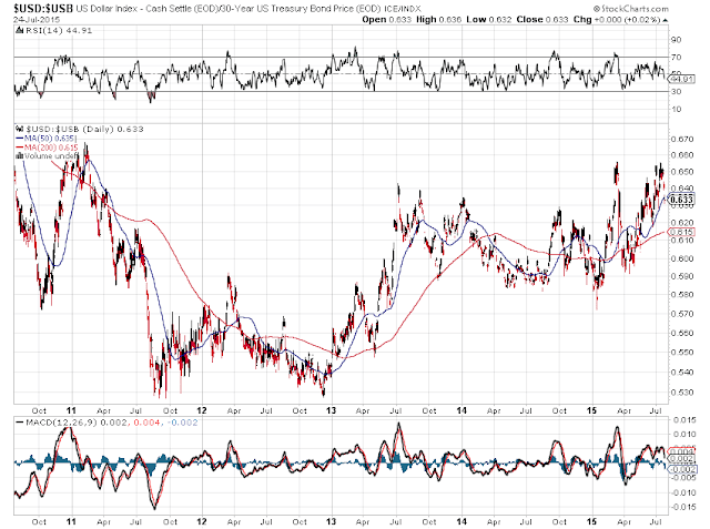 The key to direction may lie in how well the U.S. $ performs in the near-term. The following 5-Year Daily chart of $USD compares price action to $USB. Price has, basically, moved in tandem on both of these instruments since mid-2013. The RSI is still in an uptrend from May and above the 50.00 level on $USD, and major price resistance lies at 98.00.