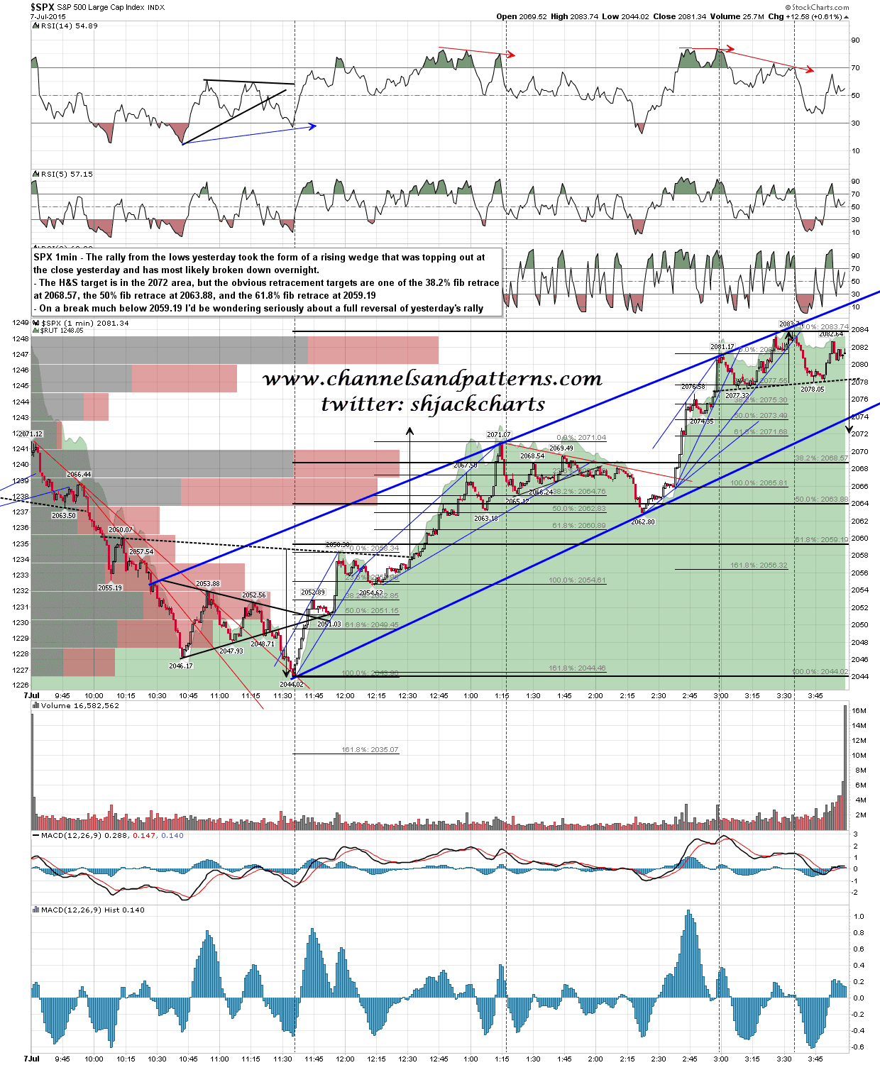 ES fell hard overnight but the rising wedge that formed from the lows yesterday was obviously topping out by the end of the day. I’m looking for a retrace into one of the main fib retrace targets which are the 38.2% fib at 2068.57, the 50% fib at 2063.88 and the 61.8% fib at 2059.19. On a move significantly below 2059.19 I would be wondering about a possible full test of yesterday’s low. SPX 1min chart: