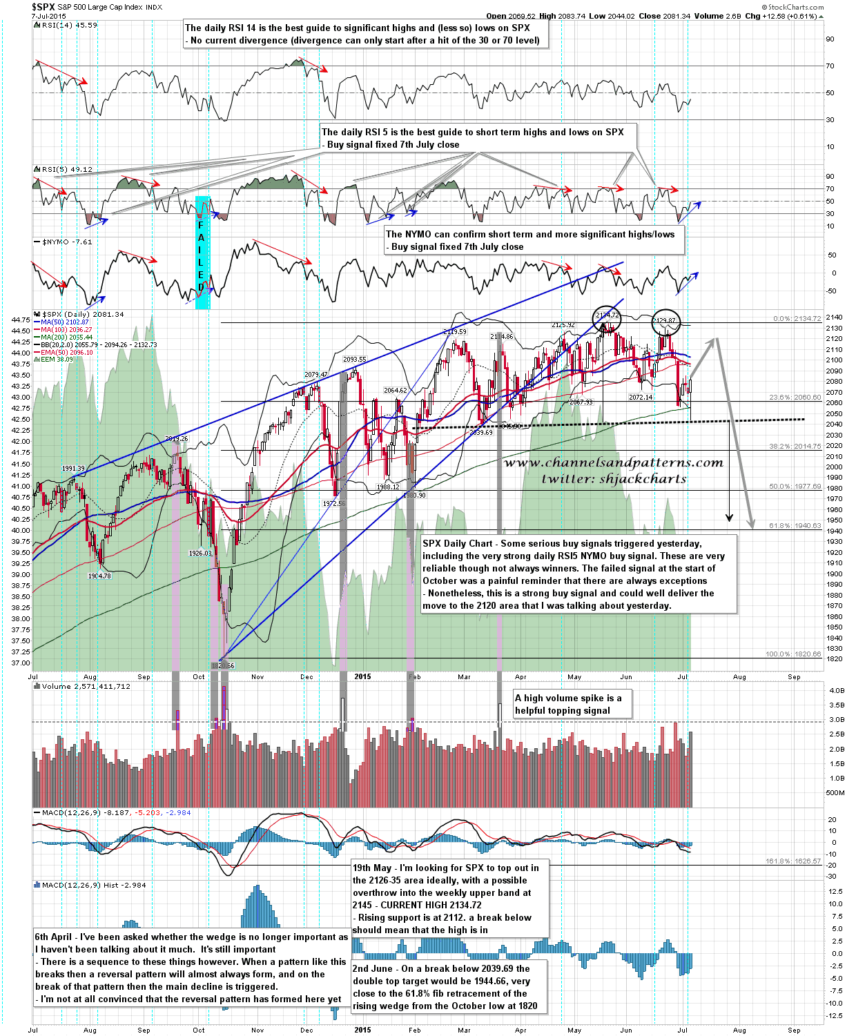 I was looking for the stronger 60min buy signal and daily RSI 5 buy signal but what surprised me somewhat was that there was also a NYMO buy signal, delivering a very strong daily RSI 5_NYMO buy signal. I’ve talked about these before and these are very reliable signals indeed. No signal is perfect though and the biggest fail in recent years was the one of these that fixed in the powerful rally in early October last year the day before the main decline into the October low started. We do therefore need to see some follow through to confirm this signal, but it’s a strong indication that SPX may indeed make the rally into 2119 that I was talking about yesterday morning. SPX daily chart: