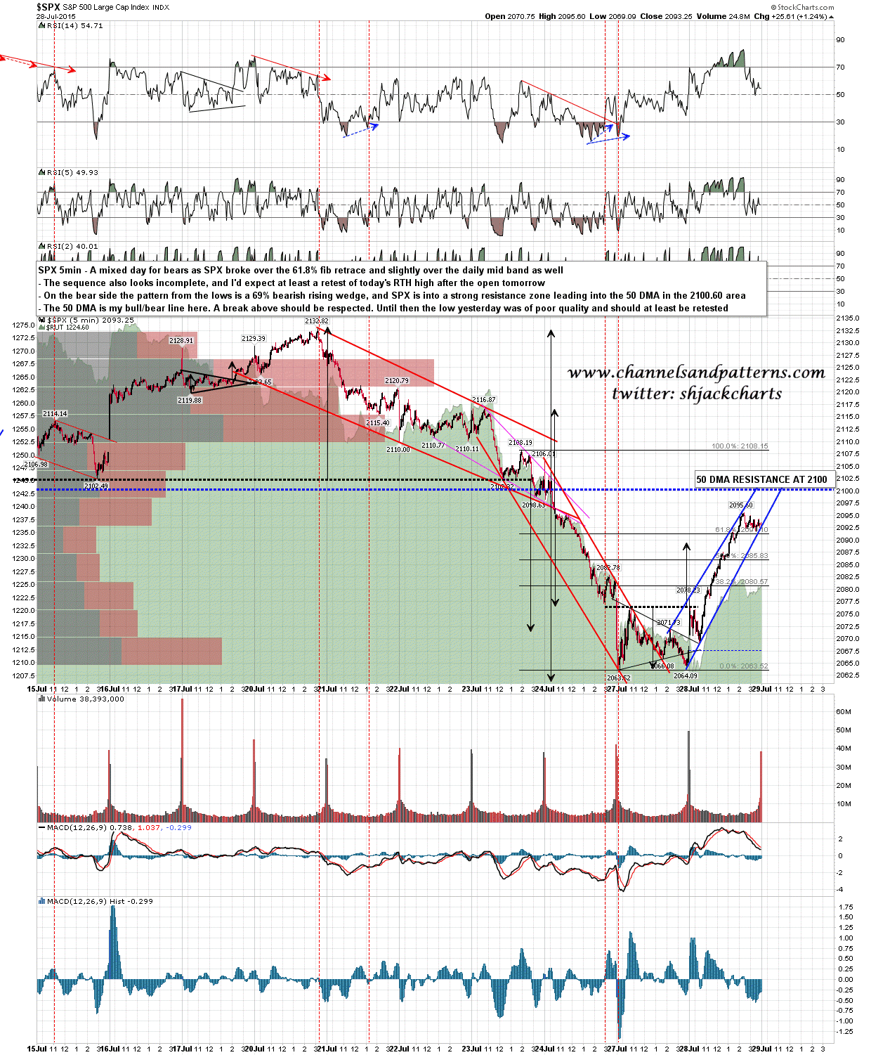 On a close below 2090 (ideally under 2085) today yesterday’s small bull breaks are negated. On an hourly close over 2103 (over 50 hour MA) there is a likely serious bull break, and on a close over 2103 (clear close over 50 day MA), there is a confirmed serious bull break. I’m leaning short until we see those bull breaks, and watching the 69% bearish rising wedge from the current retracement lows. SPX 5min chart: