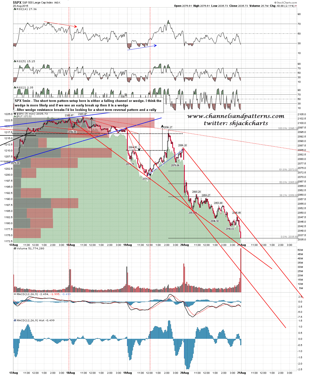 On the short term chart the pattern from Wednesday’s intraday high is either a falling wedge or channel. Preferred option is wedge but if we see early weakness today (ES trading 18 handles under the RTH close as I write), then the low should confirm which pattern this is. When it breaks up, which I’m expecting today, but in this angry tape it may not, then I’d be looking for a short term reversal pattern and a strong rally from there, into at least the daily lower band. SPX 5min chart: