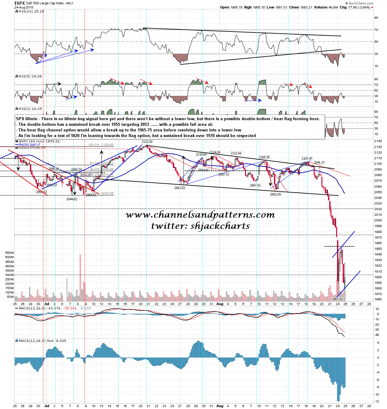 Short term I have two options for an AM high and fail today. The first is possible double bottom resistance in the 1955 area. On a break above I’d be looking for 2053. The double bottom could be a bear flag however. If that formed a bear flag channel I’d be looking for resistance in the 1965-75 area and then a fail into new lows. SPX 60min chart: