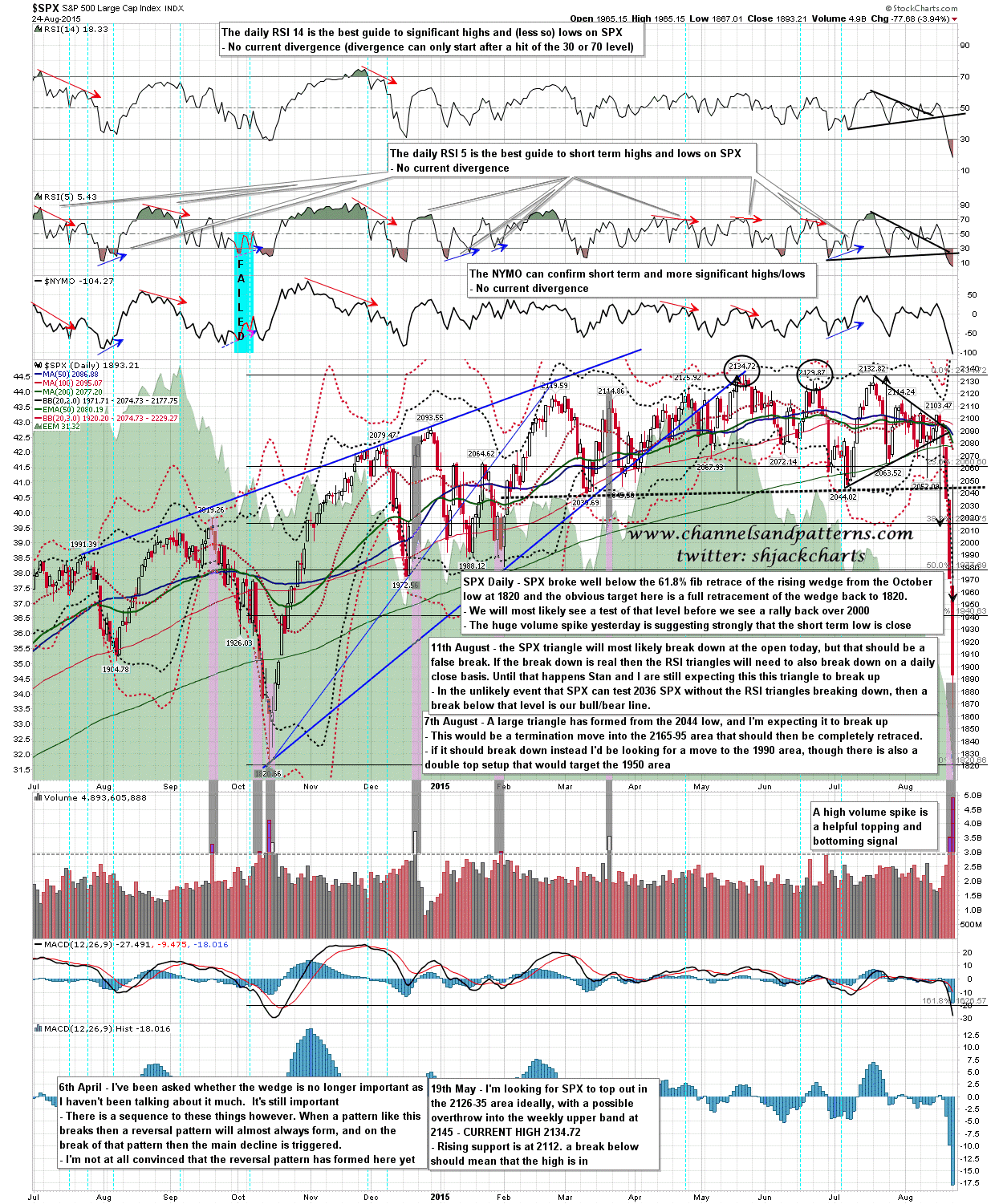 SPX broke far below the 61.8% fib retrace of the rising wedge from the October low at 1820. That makes 1820 the obvious target for the current move and if that is going to be tested I’d expect that today or tomorrow. I would also draw your attention to the huge volume spike yesterday that was the largest in the last year and considerably larger than the spike seen at the October low. A meaningful low should not be more than a day or two away. If we see a lower low I’ll be watching the 60min chart for positive divergence. SPX daily chart:
