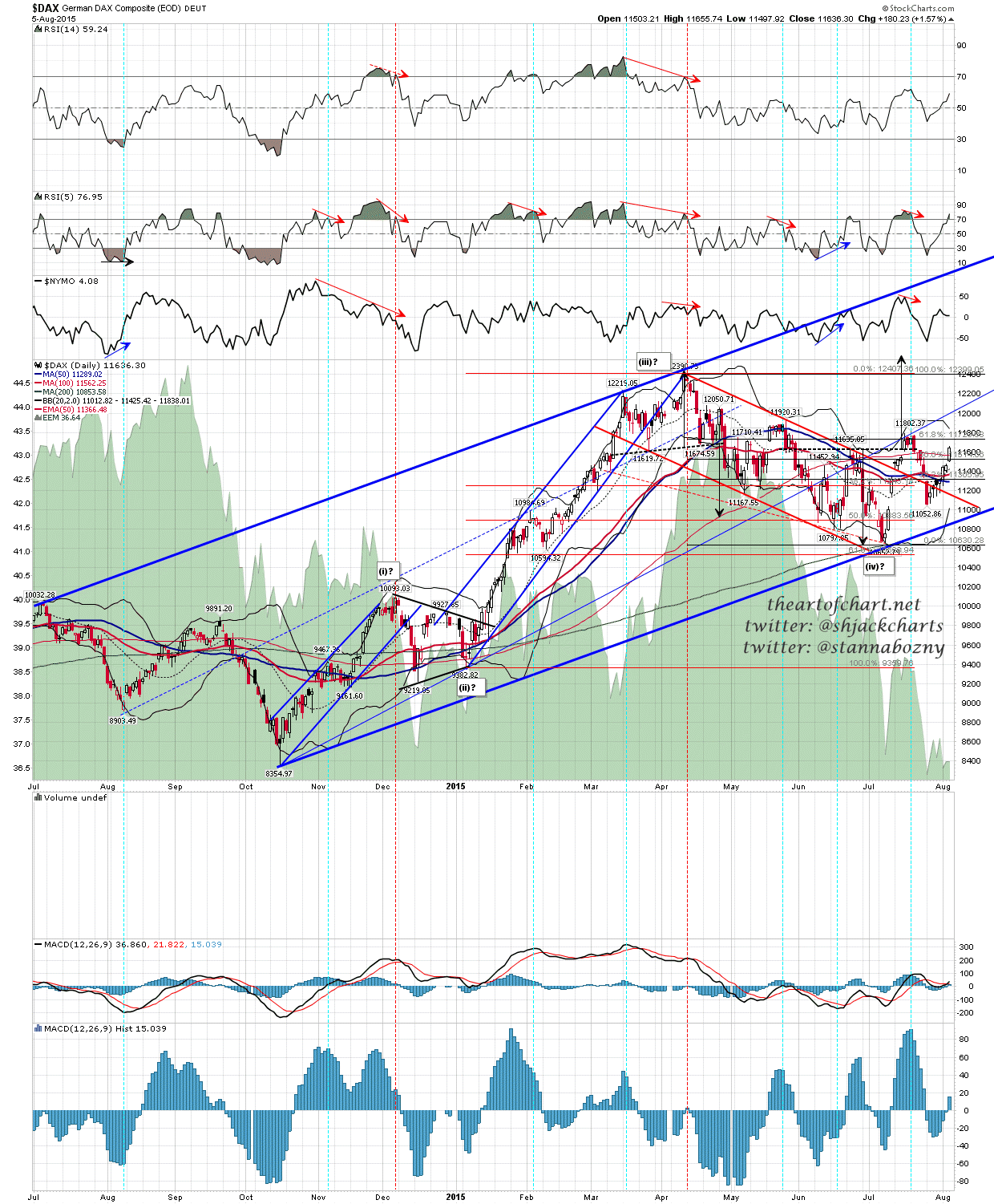 The Dow triangle is similar to the SPX version except that it has a very nice three touch resistance trendline from the July high at 18137.12. A sustained break above that would most likely signal the expected move to all time highs. INDU 60min chart:
