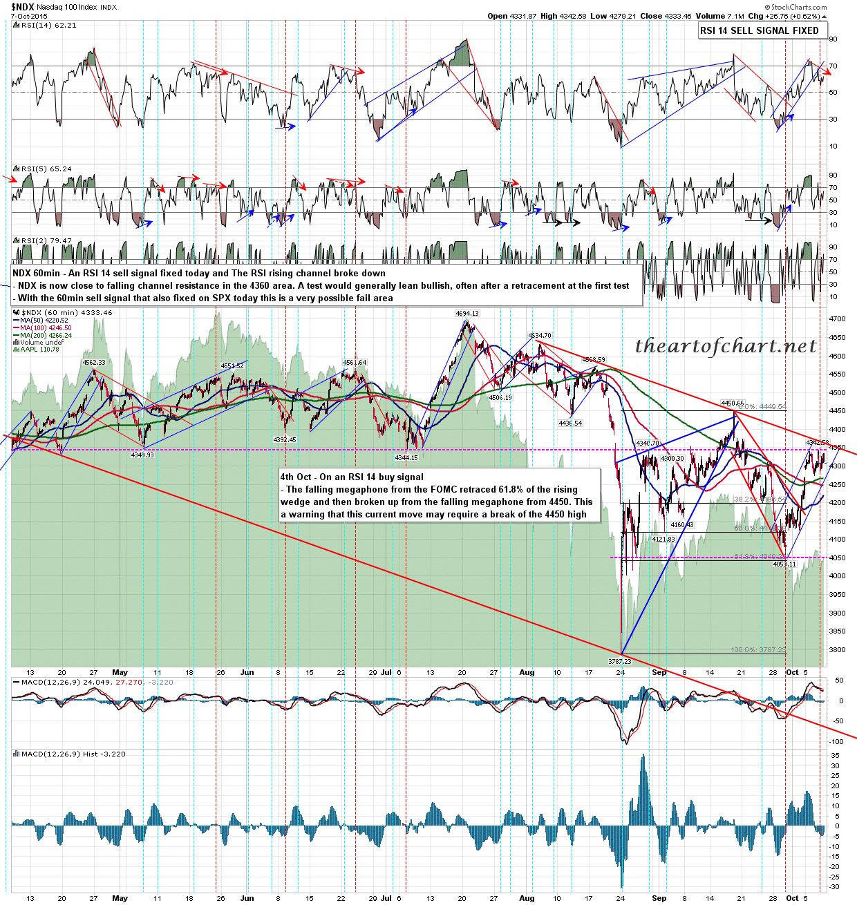 NDX has more room before a break over channel support, but should follow SPX and RUT if they break their channel support trendlines. NDX 60min chart: