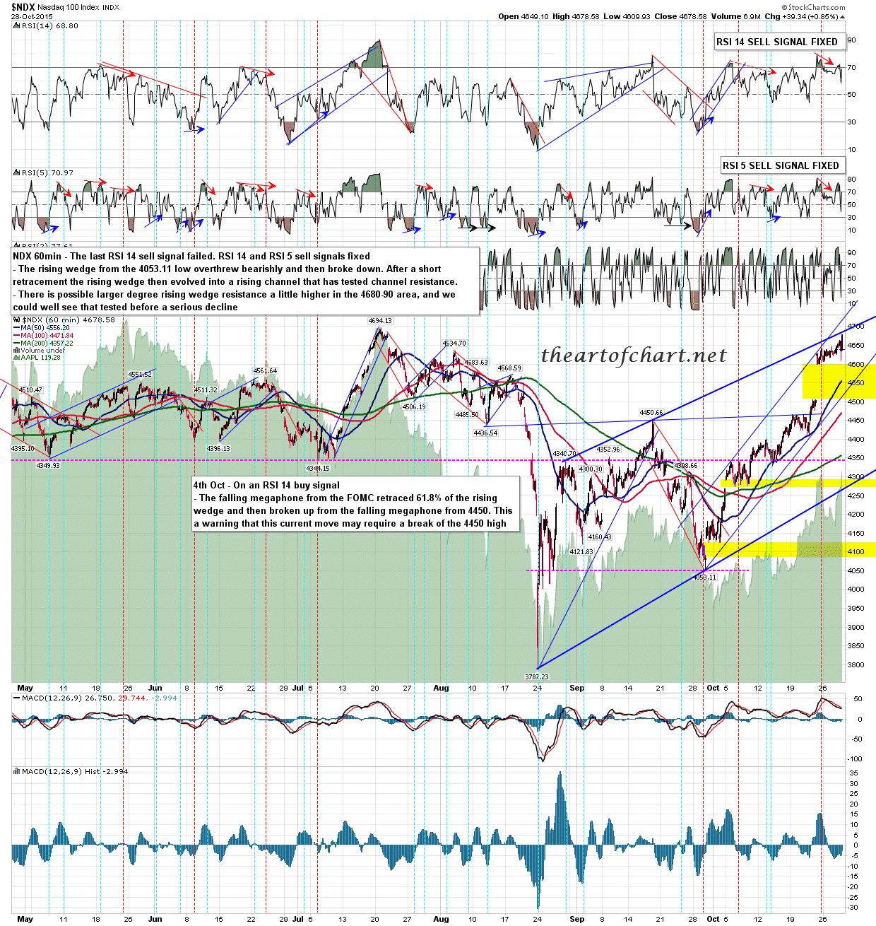NDX is reaching for the larger degree rising wedge resistance that I’ve been watching this week and needs just a little higher to hit that. A strong retracement is well overdue and should start soon. NDX 60min: