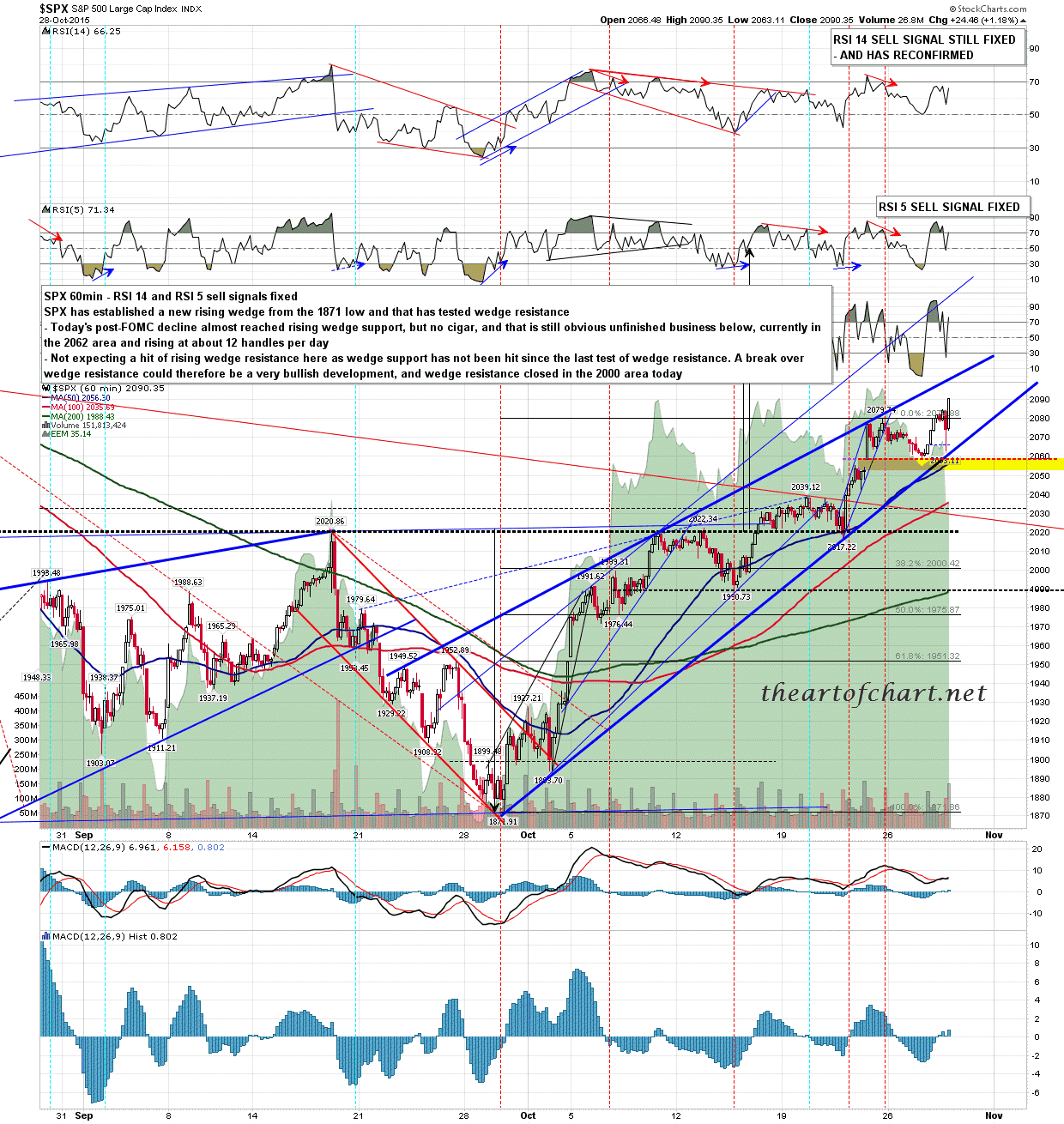 There’s not much happening on the short side here until we see a break below wedge support on SPX. In the meantime the obvious lean is a bit higher on NDX and RUT and SPX will most likely follow suit. Lean is for an AM low to buy today.