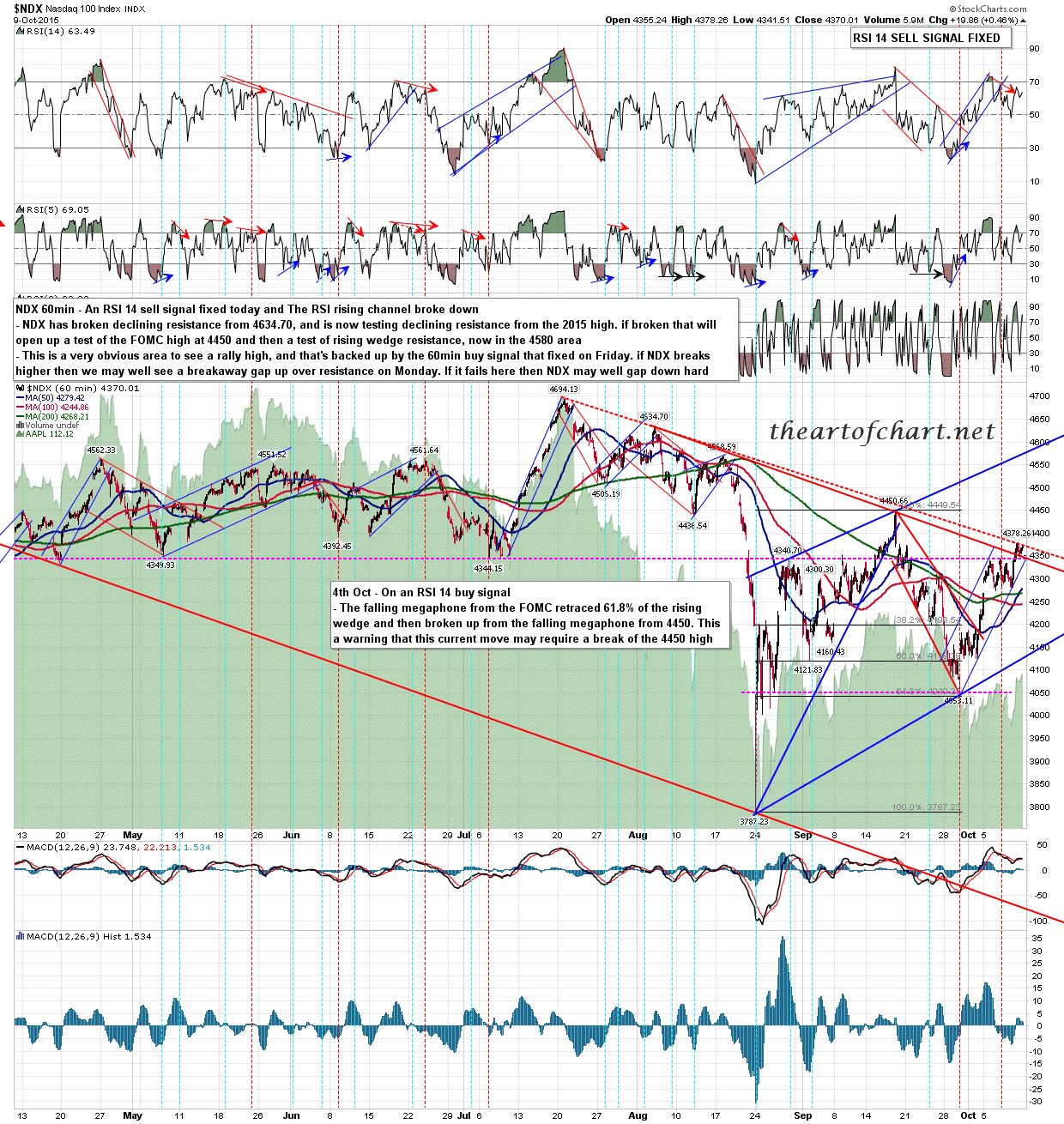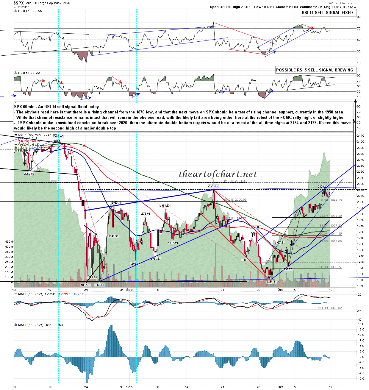 SPX is still on hourly and 15min RSI 14 sell signals, and my best prospect for an SPX pattern here is shown below. SPX 60min chart:
