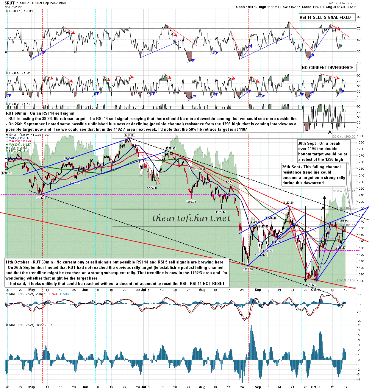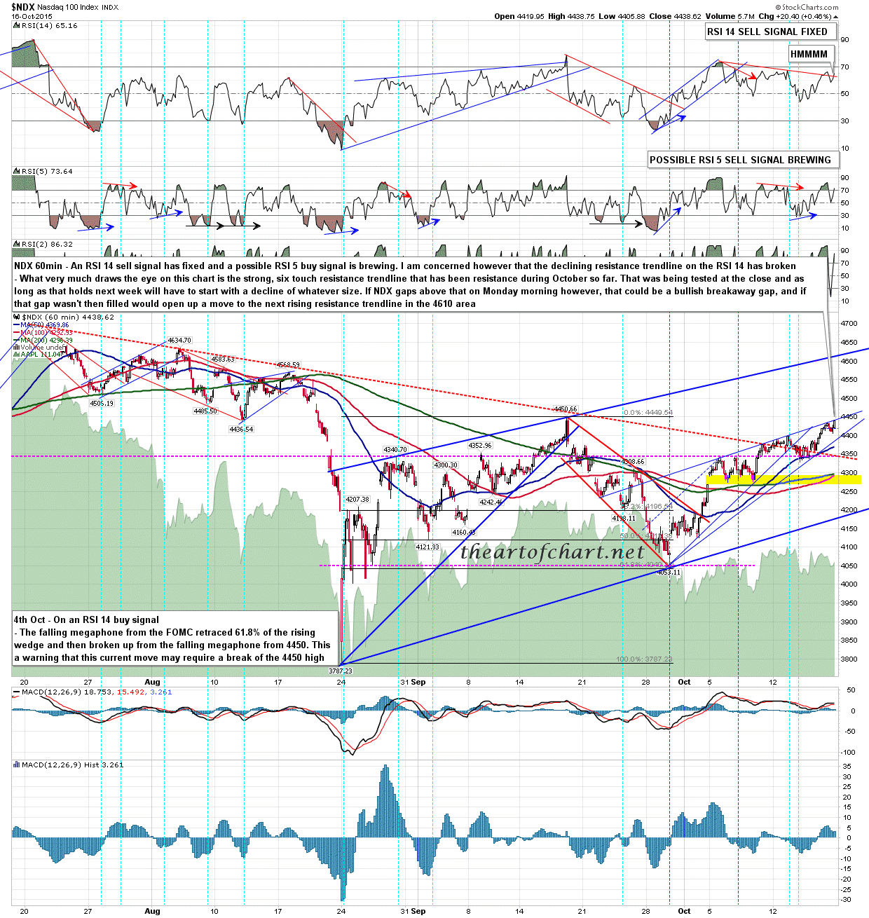 RUT is also on a 60min sell signal, as is SPX of course, but on RUT the case for going a bit higher looks compelling. I was doing monthly, weekly, daily, 60min and 15min RUT charts for theartofchart.net subscribers yesterday, and there are a lot of resistance areas across multiple timeframes meeting in the 1180 area. Resistance in the 1163-5 area has been holding very well so far, and there is a possible double top there, but on a break above I’d be looking for 1180 and that would be a decent fit with a 4450 test on NDX. RUT 60min: