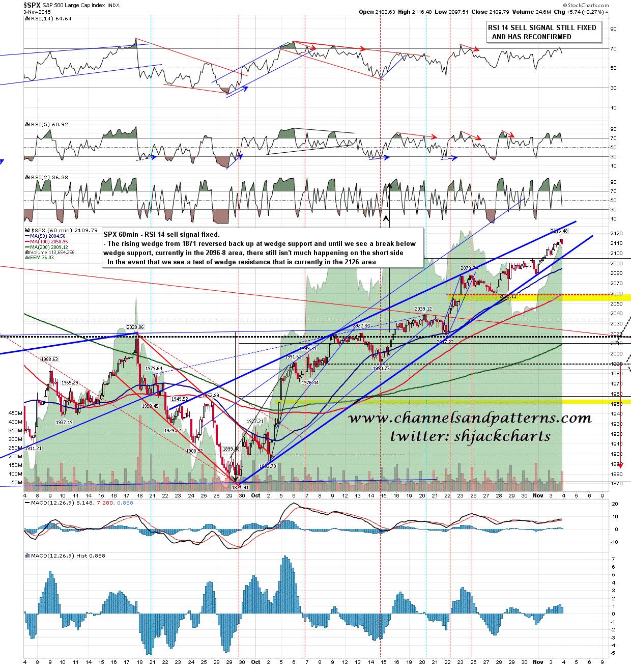 SPX has had a nice move up from the touch of rising wedge support at the close last Friday. That formed a small rising channel that broke down yesterday afternoon. Bears have a shot here at breaking rising wedge support, currently in the 2096-8 area and multiple sell signals are suggesting that it may well break here. SPX 60min chart: