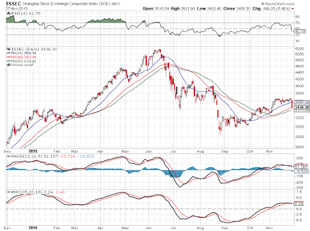 Otherwise, a break and hold below the 40 MA will signal that the bearish scenario (that I outlined in the above post) is imminent, in my opinion…all three indicators on the Daily chart below of SSEC now display “SELL” signals.