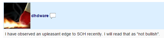 The zeitgeist in the comments section is partly driven by the market. Since Slope is a bearish blog, a strong, uptrending market tends to create a lot of angst and mud-slinging, whereas a downtrending market (which happens a few days every seventeen years or so) creates a lot of hugging, back-slapping, and A-frame man-hugs. Indeed, I strongly agree with this comment posted this weekend: