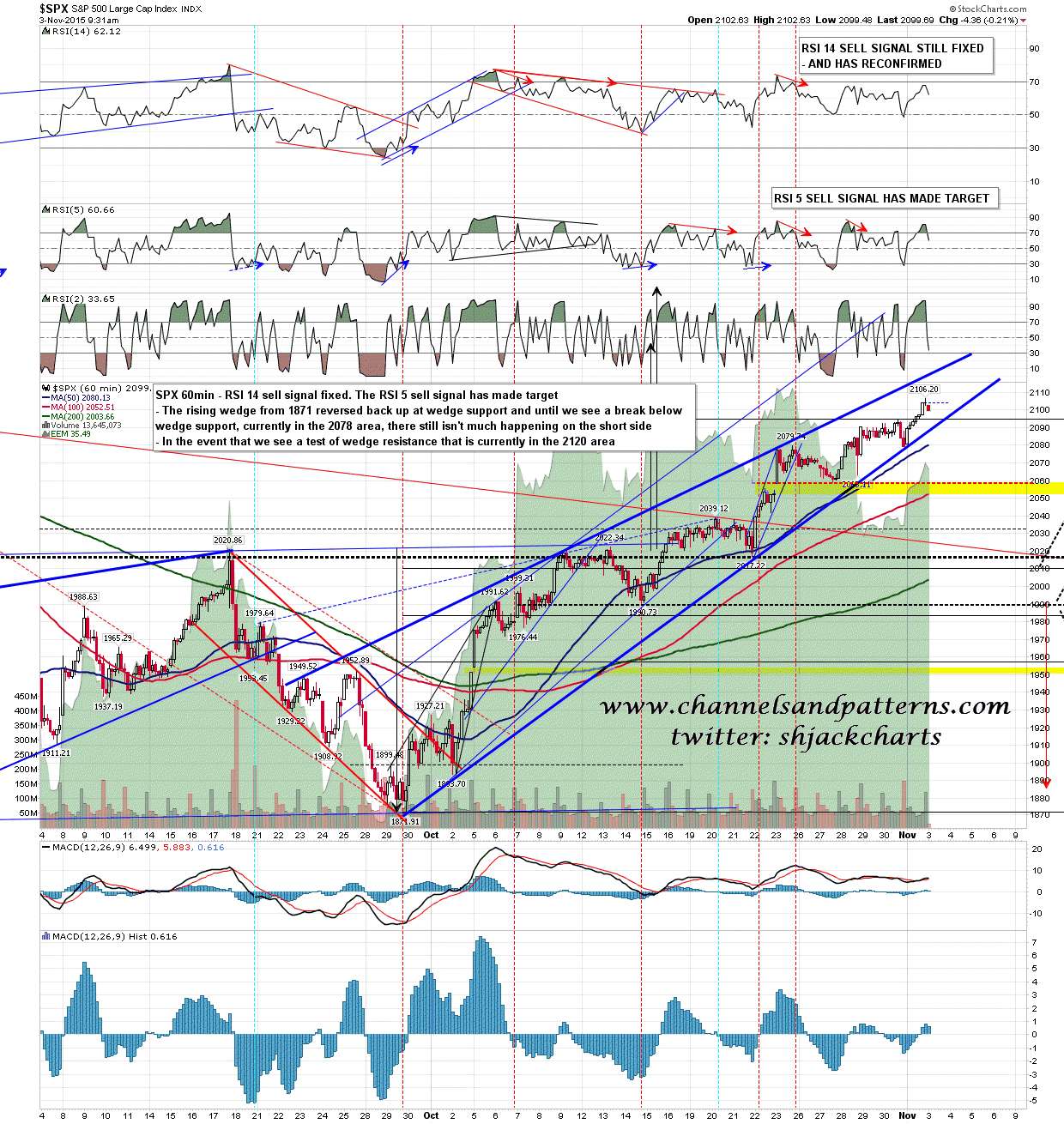 NDX has now made a decent hit of the rising wedge resistance from the August low that I put forward in mid-October as a possible target. As with SPX there is strong negative divergence and the uptrend on NDX could fail at any time. NDX 60min chart: