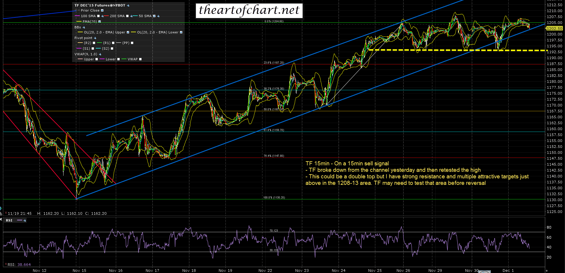 The best pattern setups here are on RUT and TF and I’d note that I have open targets below in the 1185 RUT and 1180 TF areas. We might see a bounce first but they should be hit soon. TF 15min chart: