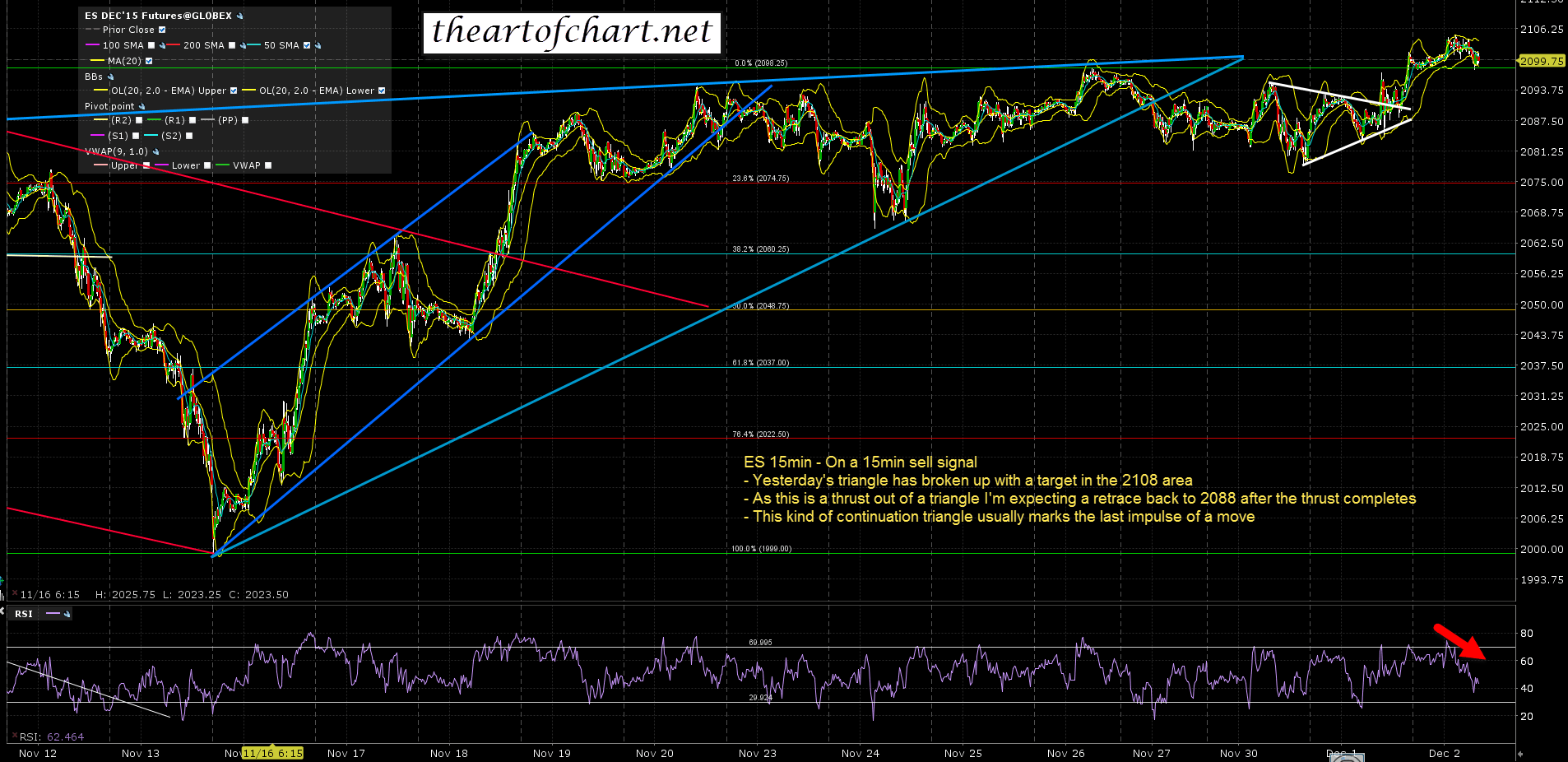 The other thing to consider is that this kind of triangle setup generally marks the end of a move, so the next obvious step after the triangle thrusts ends would be a retracement that would take out Monday’s low on the way to targets lower down. I’ll be watching for a pattern for the triangle thrust and will be calling it on twitter when it breaks down. ES 15min chart: