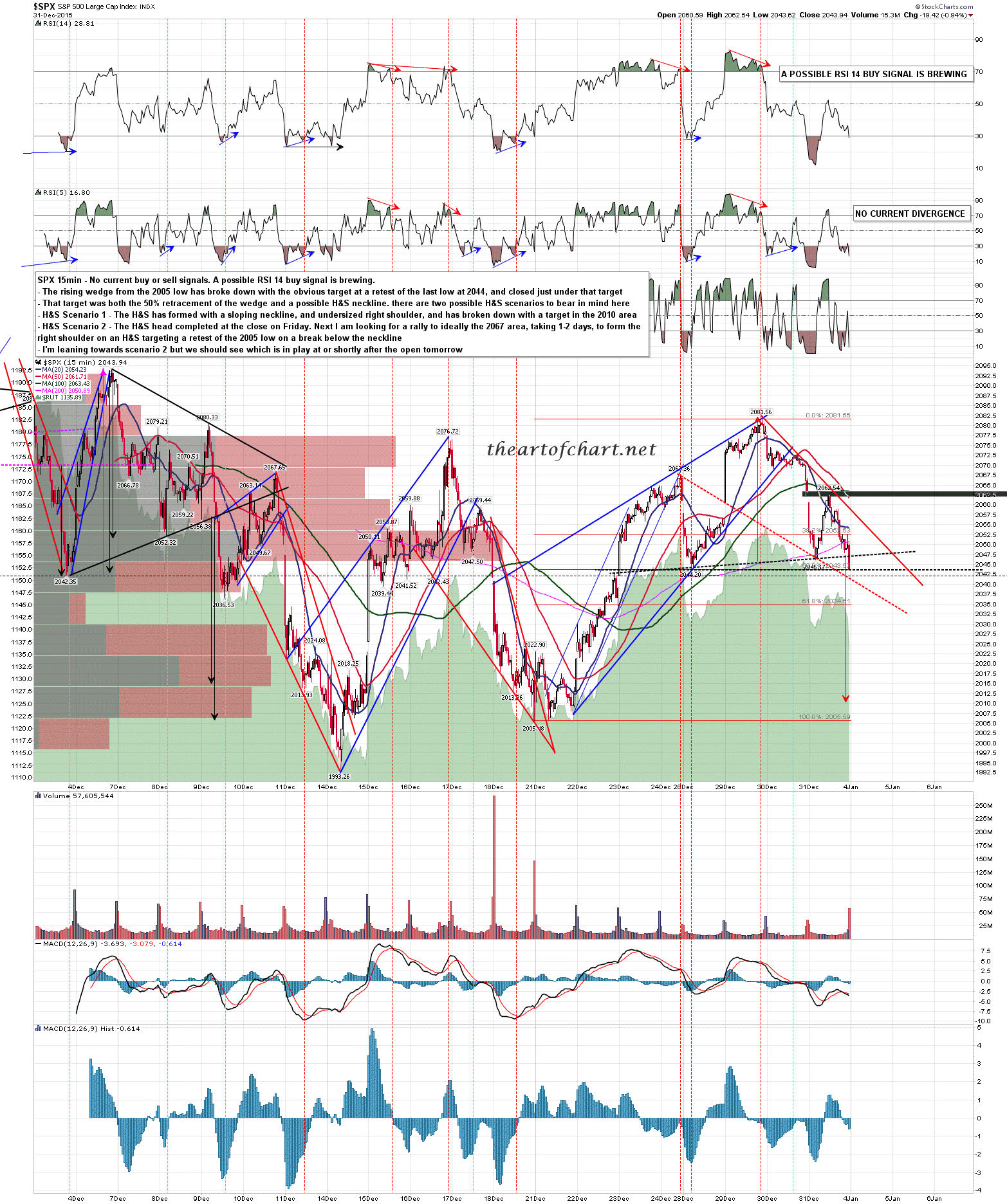 When I was doing the chart below for theartofchart.net subscribers last night I laid out two H&S scenarios and favored the second one, with the caveat that we should know which option would be taken at or soon after the open today. Obviously SPX has gone with option 1 and is likely to open close to that H&S target in the 2010 area. SPX 15min chart: