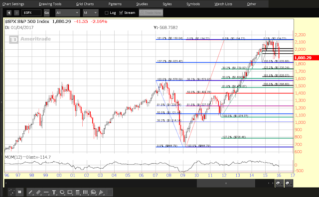 The Monthly chart below of the SPX shows where price closed today (Friday) in relation to its lows of 2009. The price has been bouncing in between two external Fibonacci retracement levels (127% and 161.8%) since October 2014 — which represent major resistance and near-term support levels.