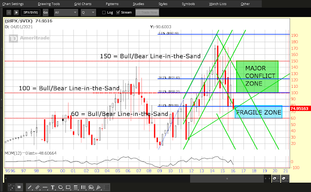 Further to my post of December 3, 2015, the price of the SPX:VIX ratio has broken below a critical level of 100.00 and has fallen into, what I call, the Fragile Zone.