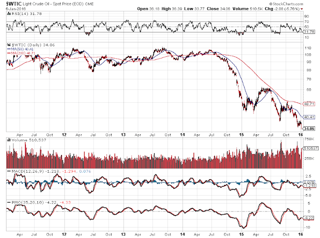 Since December of last year, Gold and Platinum have attempted to stabilize and rally from their 3-year lows, while Oil’s attempted rally was very short-lived, and price continues to plummet to new lows…we’ll see if today’s (Wednesday’s) volume spike signals capitulation, or not, as shown on the next chart (5-Year Daily).